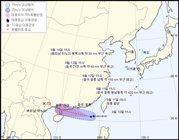 이후 16일 오전 9시에는 중국 홍콩 남동쪽 약 200KM 부근 해상,17일 오전 9시에는 중국 잔장 북북서쪽 약 130KM 부근 육상에 상륙할 것으로 전망 됩니다.